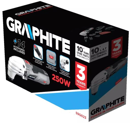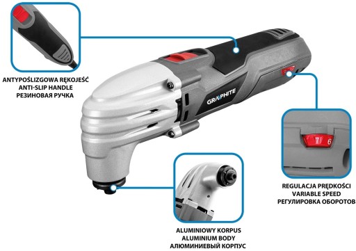 Wielofunkcyjne narzędzie od marki GRAPHITE, charakteryzujące się mocą 250 W. Głowica szlifierki tego typu wykonuje minimalnie 15 000, a maksymalnie nawet do 21 000 oscylacji na minutę pod kątem 3,2°. Umożliwia także praktyczną regulację oscylacji. Wyposażona w zestaw sześciu końcówek roboczych, polecana jest do wielu zastosowań: