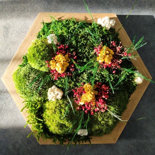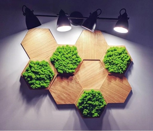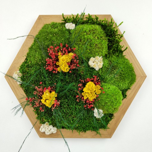 Oferta dotyczy jednego panela drewnianego składającego się z dębowej ramki oraz wypełnienia z roślin stabilizowanych w tym mchu płaskiego i poduszkowego. Dekoracja w formie sześciokąta foremnego wykonana z najwyższej jakości, wyselekcjonowanych i oczyszczonych odmian mchu.