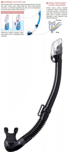 Fajka TUSA HYPERDRY ELITE II SP-0101 z hypoalergicznym silikonowym ustnikiem, który zapewnia komfort użytkowania i górnym zaworem HYPERDRY ELITE zabezpieczającym przed zalewaniem fajki wodą podczas całkowitego zanurzenia.