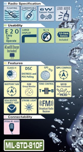 HX-890 w przypadku wpadnięcia do wody – od razu sygnalizuje swoją obecność czerwonym migającym światłem LED (przydatne szczególnie nocą). Funkcja ta działa nawet przy wyłączonej radiostacji.