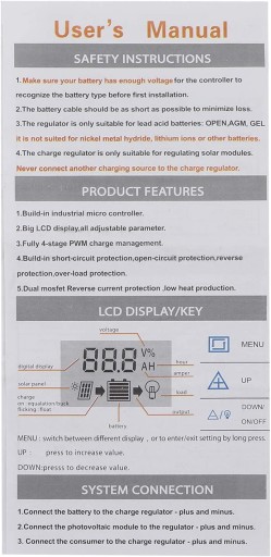Z zabezpieczeniem przed zwarciem obwodem otwartym ochron przed odwrotnym poczeniem i ochron przed przeci Duy wywietlacz LCD przejrzysty i intuicyjny a parametry s regulowane. Podwójna ochrona przed prdem wstecznym niska emisja ciepa. Podwójne wyjcie USB maksymalny prd wynosi 25 A obsuga adowania telefonu komórkowego z systemem iOS co jest wygodne. Wbudowany mikrokontroler przemysowy automatycznie zarzdza prac paneli sonecznych i akumulatorów w instalacjach sonecznych. 3stopniowe zarzdzanie adowaniem PWM moe poprawi wydajno systemu i wyduy ywotno baterii.