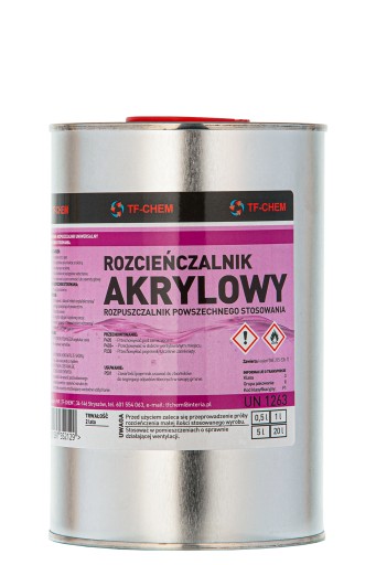 Rozcieńczalnik do systemów akrylowych jest mieszaniną odpowiednio dobranych, wysokiej jakości rozpuszczalników organicznych. Produkt przeznaczony do rozcieńczania produktów akrylowych - lakierów bezbarwnych oraz podkładów. Pozwala w efekcie, uzyskać wyrób o ściśle określonych parametrach. Zapewnia ich odpowiednie nanoszenie, rozlewność i wysychanie.
