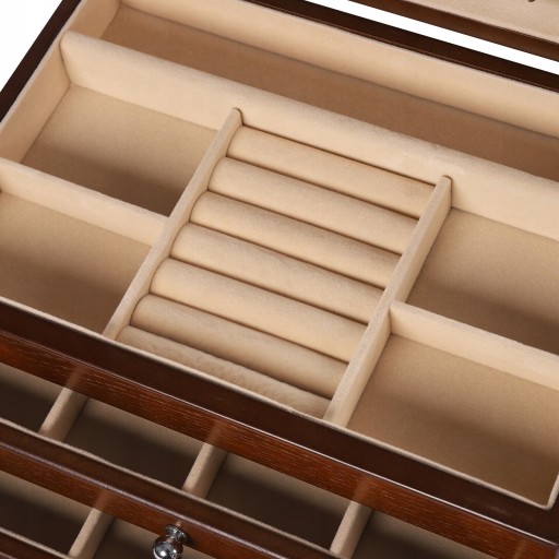 Sortowane przechowywanie: 3-wysuwane szuflady mogą sortować i przechowywać niektórą biżuterię. Twoje często noszone kolczyki, pierścionki i inne biżuterie można przechowywać w górnej otwartej pokrywce tacy na biżuterię, która została zaprojektowana ze specjalnymi sekcjami na pierścionki i zegarki.