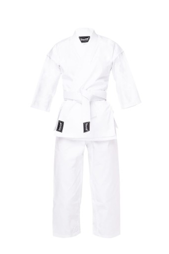 Kimono do karate Evolution uszyte zgodnie z klasycznym wzorem z wysokiej jakości bawełny. Doskonale obszyte i skrojone. Wzmocnione dodatkowymi przeszyciami w miejscach najbardziej narażonych podczas treningu. Karatega odpowiednia dla zawodników w każdymi wieku. Dla wygody zawodnika w pasie zastosowano gumkę. Kimono wyposażone zostało w biały pas.
