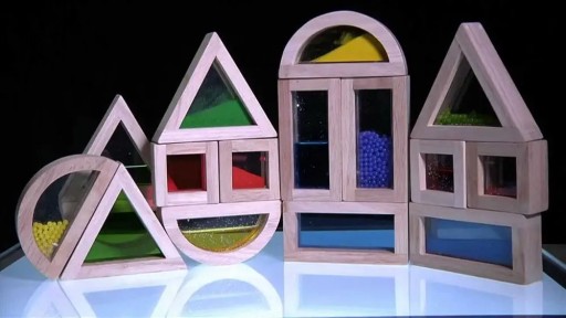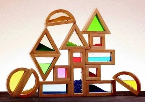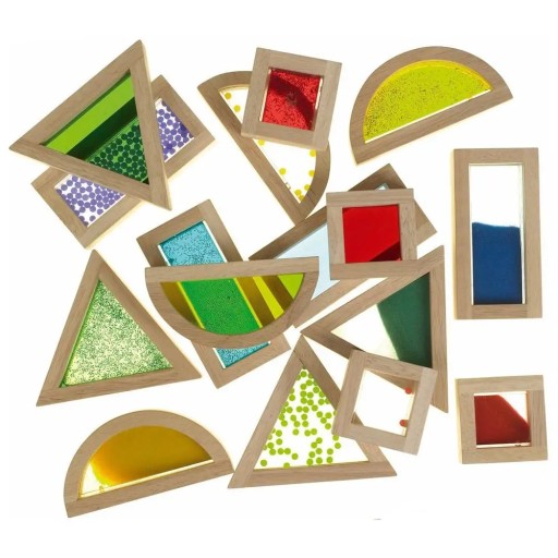 16 dużych klocków z drewna kauczukowego, zawierających koraliki, przezroczysty akryl, kolorowy piasek i wypełnione wodą/brokatem kieszenie w 4 różnych kształtach (kwadrat, prostokąt, trójkąt i półokrąg).