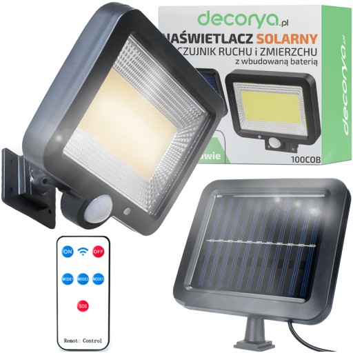 Zewnętrzny naswietlacz solarny firmy Decorya to nowoczesne i ekonomiczne rozwiązanie do Twojego domu, firmy, ogrodu czy działki. Bezprzewodowość, potężna dioda 100COB, płynna regulacja kąta padania światła i wodoodporność IP65 czynią ją wszechstronnym i uniwersalnym rozwiązaniem. Natomiast wykrywanie ruchu oraz czujka zmierzchu pozwoli na na zautomatyzowanie oświetlenia.