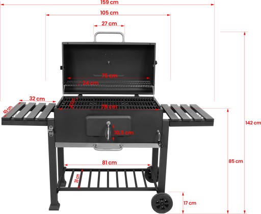 - Produkt posiada wszelkie wymiary i cechy zgodne z normą dotyczącą grilli węglowych EN 1860-1:2013 + A1:2017