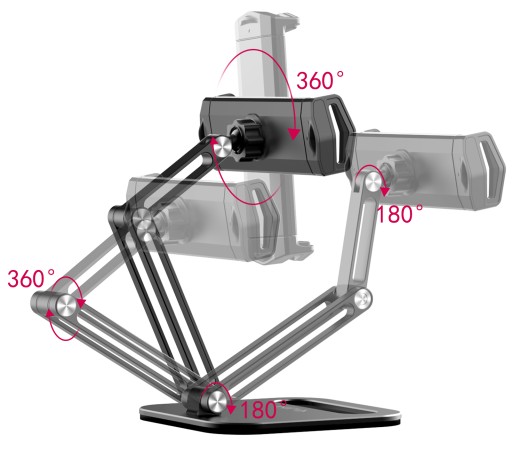 Ramię w dwóch miejscach można obrócić w zakresie 180 stopni, w jednym miejscu o 360 stopni.