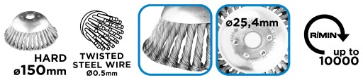 Szczotka druciana do kosy spalinowej 150 x 25,4 mm, twarda, druty splątane 55H100 marki GRAPHITE to tarcza szczotkowa do kos spalinowych. Posiada wymiary 150 x 25,5 mm średnicy zewnętrznej oraz wewnętrznej otworu. Umożliwia czyszczenie kostek brukowych oraz metalowych powierzchni. Wykonana została z trwałego splotu drucianego. Marka GRAPHITE jest gwarancją trwałości na lata.