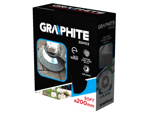 Szczotka druciana do kosy spalinowej 200 x 25,4 mm, miękka, druty falowane 55H103 marki GRAPHITE to tarcza szczotkowa do kos spalinowych. Posiada wymiary 200 x 25,5 mm średnicy zewnętrznej oraz wewnętrznej otworu. Umożliwia dokładne czyszczenie kostek brukowych oraz metalowych powierzchni. Wykonana została z trwałych, falowanych drutów. Marka GRAPHITE jest gwarancją trwałości na lata.