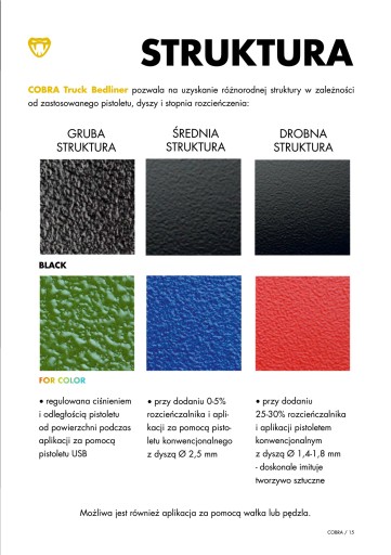 COBRA Superior pozwala na uzyskanie różnych efektów strukturalnych w zależności od stopnia rozcieńczenia i średnicy dyszy użytej do aplikacji.