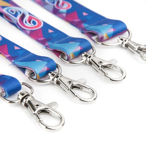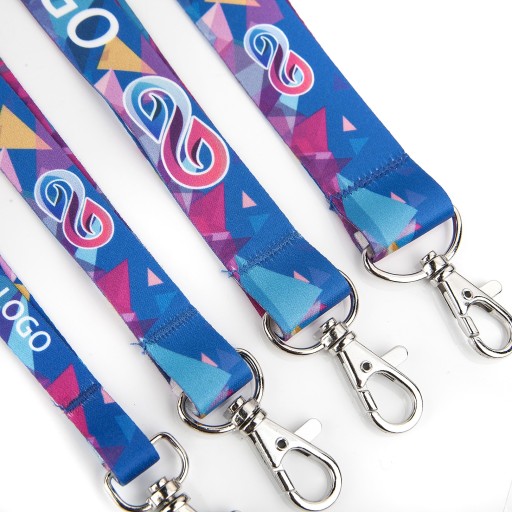 Dwustronnie zadrukowana smycz o szerokości 20mm zakończona srebrnym karabińczykiem