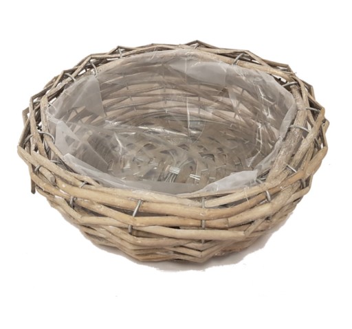 wykonany z naturalnego materiału: wikliny; rękodzieło; wiklina naturalna: kolor brązowo/szary, kształt okrągły lekko owalny; delikatnie węża się ku dołowi; w środku obszyty transparentną folią ochronną, zastosowanie dom i ogród.