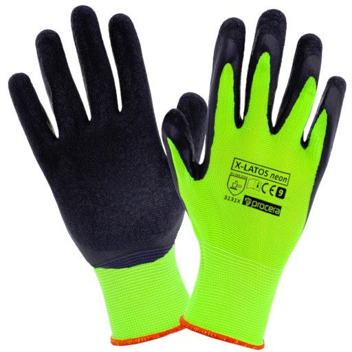 Rękawice X-LATOS NEON wykonane z poliestru w jaskrawym zielonym kolorze, powlekane w części chwytnej lateksem o szorstkowanej strukturze. Idealne do prac manualnych. Bardzo dobra chwytność. Dobrze dopasowują się do kształtu dłoni. Rozciągliwe i elastyczne. Zakończone ściągaczem.
