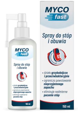 Mycofast spray do stóp i obuwia to płyn przeznaczony do dezynfekcji wnętrza obuwia o działaniu bakteriobójczym i grzybobójczym oraz do nieuszkodzonej, chorobowo niezmienionej skóry stóp o działaniu bakteriobójczym i drożdżakobójczym.
