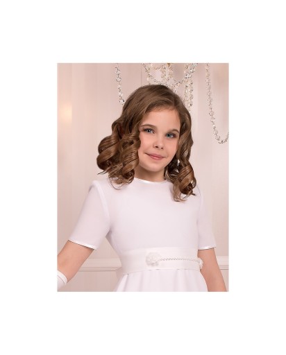 Alba komunijna, zdobiona na pasku perełkami i kwiatkami. Dekolt i rękawki wykończone satynową tasiemką. Praktyczny w użyciu mało gniotący się materiał. Sukienka z halką. Materiał żorżeta gładka-stretch.