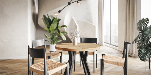 Elegancki stół w loft na drewnianych nogach z blatem z płyty laminowanej.