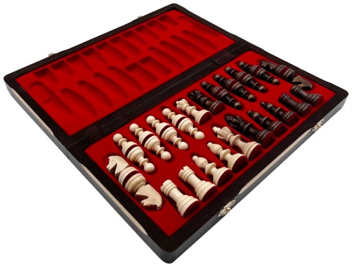Szachownica wykonana z drewna lipowego, bejcowana oraz lakierowana, okuta zapięciem w odcieniu złota. Środek wyłożony bordową wkładką.