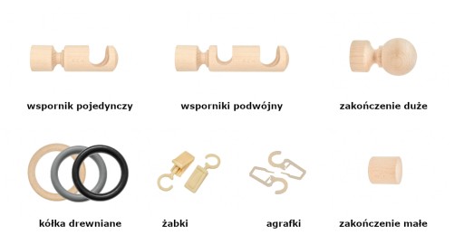 Na naszych aukcjach posiadamy również poszczególne akcesoria do karniszy drewnianych, dzięki którym jest możliwe rozbudowanie zestawu lub wymiana uszkodzonych części.