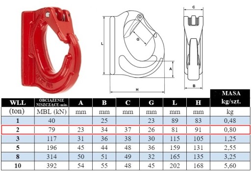 - Oznakowanie haka: kodem producenta, WLL, rozmiarem, CE