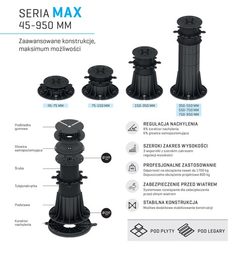 -WSPORNIKI REGULOWANE od 17 mm - 900 mm z płynną regulacją wysokości na gwincie oraz dodatkowo głowice samopoziomujące, . Wsporniki regulowane dzięki dodatkowym adapterom znajdują zastosowanie do montażu legarów.