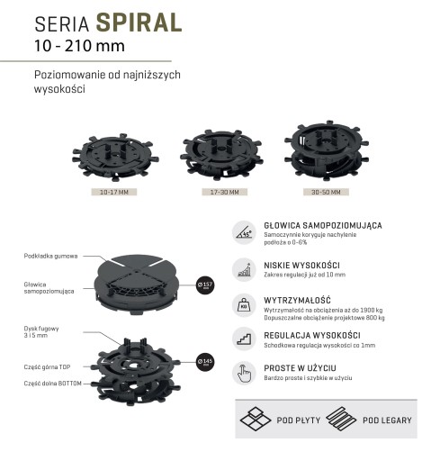 -WSPORNIKI REGULOWANE typu SPIRAL ze schodkową regulacją co 1mm w zakresie regulacji od 10 mm - 270 mm. Wsporniki oferujemy do montażu płyt gresowych lub legarów