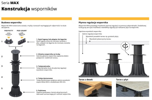 -WSPORNIKI REGULOWANE od 17 mm - 900 mm z płynną regulacją wysokości na gwincie oraz dodatkowo głowice samopoziomujące, . Wsporniki regulowane dzięki dodatkowym adapterom znajdują zastosowanie do montażu legarów.