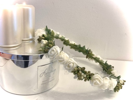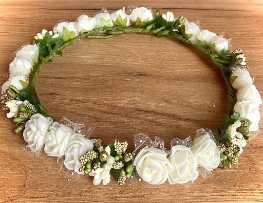 Wymiar standardowego wianka to około 53cm, z możliwością regulacji. Kolorystyka: śmietankowa, złamana biel, ale na życzenie klienta możliwa jest dowolna modyfikacja kolorystyczna, ponieważ wianuszki wykonujemy na bieżąco, pod potrzeby konkretnego klienta. Wianek wygląda prześlicznie i przykuwa uwagę ze względu na gęsto zaplecione dodatki. Z drugiej strony jest elegancki, skromny i stosowny do okazji. Tylko teraz w promocyjnej cenie. Serdecznie zapraszam!