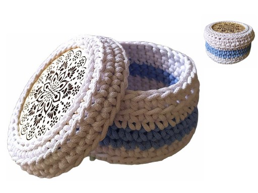 Elegancki koszyk z pokrywką wykonany ręcznie ze sznurka bawełnianego.