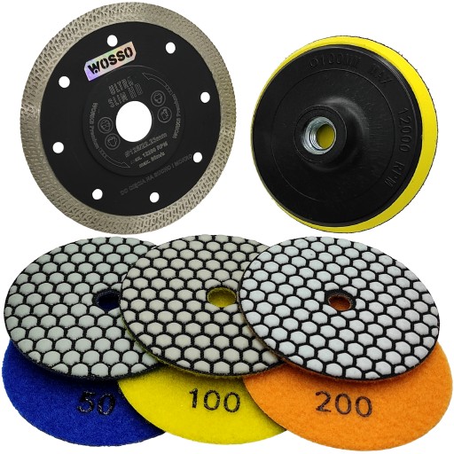 Zestaw tarcz diamentowych do CIĘCIA fi 125mm x 1,2mm i SZLIFOWNIA fi 100mm krawędzi gresu, płytek, ceramiki, kamienia itp. + DYSK z rzepem fi 100mm mocujący tarcze, pady diamentowe.