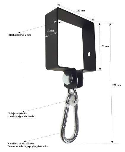 Przeznaczone są do montażu siedziska huśtawek na belce, znajdą też zastosowanie przy montowaniu huśtawki bocianie gniazdo czy worka bokserskiego.