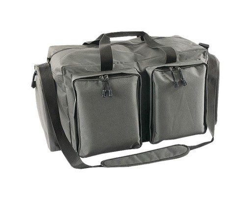 Torba wykonana z mocnego materiału w kolorze jak na zdjęciu. Zaopatrzona w wiele przegród i kieszeni pozwalających bezproblemowo zmieścić sporą cześć naszego ekwipunku wędkarskiego. Torba posiada bardzo mocne suwaki. Do jej noszenia służy mocny szeroki i regulowany na długości pas z naramiennikiem. Bardzo duża komora główna i dodatkowo cztery kieszenie dwie boczne i dwie z przodu.