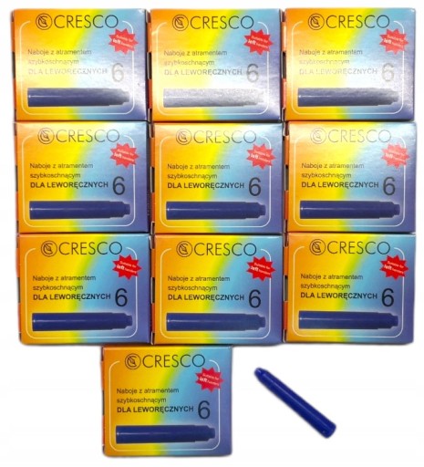 ✅Naboje atramentowe marki CRESCO wyposażone w najwyższej jakości atrament szybkoschnący rekomendowany dla osób piszących lewą ręką w kolorze niebieskim.