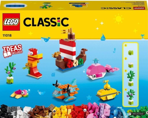 - Pomysłowa zabawa dla dzieci w wieku od czterech lat — zestaw LEGO® Classic Kreatywna oceaniczna zabawa (11018) zawiera mnóstwo kolorowych elementów LEGO i pomysły na zbudowanie sześciu morskich modeli, które zachęcają do zabawy