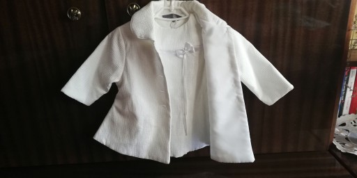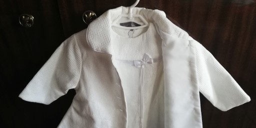 Śliczny komplecik dla małej dziewczynki w wieku 2-4 miesiące na chrzest lub inne uroczystości. Komplet składa się z sukieneczki oraz płaszczyka. Materiał ma bardzo fajną i ładną fakturę, wytłoczona krateczka a na niej małe różyczki. Wymiary na płasko: