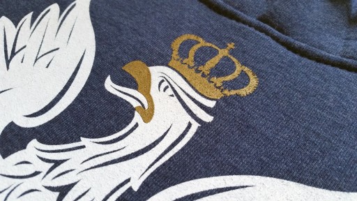 Nadruk z przodu wykonany jest mieszanymi metodami sitodruku. Dla dodatkowego wyróżnienia dumy polskiego, białego orła użyliśmy złotej farby (brokatowa) dającej efekt połysku. Do jak najlepszego odwzorowania i intensywności bieli postanowiliśmy nałożyć 2 warstwy farby.