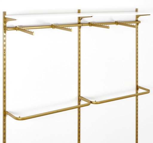 Łatwość montażu: Jedyny stały element systemu to szyny ścienne, które należy solidnie zamontować do ściany. Wszystkie inne element jak wieszaki ramowe, przeglądarki, poprzeczki, wieszaki odzieżowe lub wsporniki półki montujemy wpinając je w perforacje, które znajdują się na całej długości szyn.