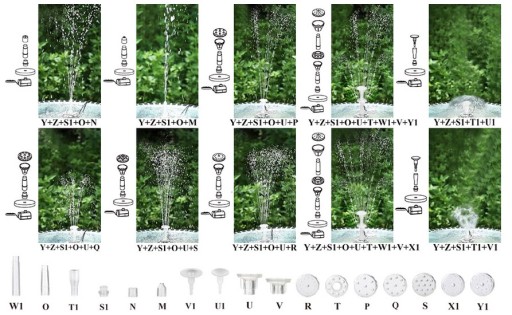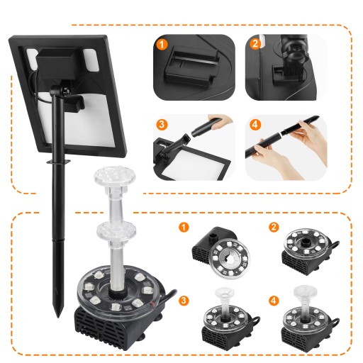 10 różnych dysz słoneczna pompa wodna może spełnić Twoje różne potrzeby dotyczące wysokości strumienia lub kształtu strumienia. Wysokość może być regulowana przez zmianę dysz, aby uniknąć rozlania z umywalki. Idealny do kąpieli ptaków, akwariów, małych stawów, basenów ogrodowych - obieg wody dla tlenu.