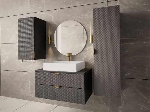 Przedstawione meble łazienkowe Aniabo I z umywalką to połączenie nowoczesnego stylu oraz funkcjonalności. Złote uchwyty dodają elegancji, a ozdobne fronty wyglądają bardzo efektownie.