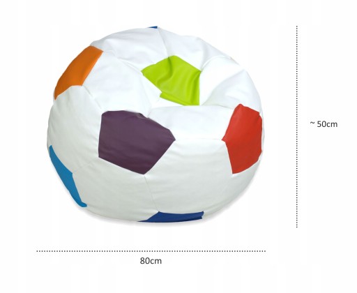 Przedmiotem aukcji jest piłka pufa "kolorowe szaleństwo" o pojemności 300L. Wersję kolorystyczną należy wybrać przy zakupie z dostępnych modeli z wzornika, bądź skomponować własną. Instrukcje dot. dobierania kolorów opisujemy w tekście poniżej. Wymiary pufy to 80cm szerokości, 80cm głębokości oraz 50cm wysokości. Należy pamiętać, że pufa jest meblem bezszkieletowym, dlatego jej wymiary mogą się zmieniać w zależności od wagi osoby użytkującej oraz ułożenia pufy. Pufa jest wypełniona wysokiej jakości granulatem EPS który posiada atest PZH. Polistyrenowe kulki swobodnie przemieszczające się wewnątrz pufy są surowcem wysokiej jakości, zapewniają wysoki komfort użytkowania zarówno dla dzieci jak i dorosłych. Materiał z którego została wykonana - ekoskóra dollaro, również posiada atest PZH.