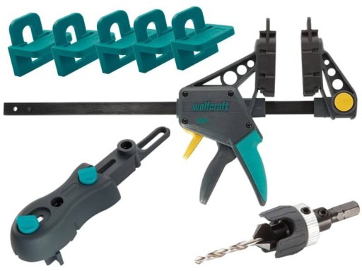 Ścisk montażowy jest niezbędny do szybkiego i dokładnego rozmieszczenia i wyrównania desek tarasowych a w połączeniu z adapterami dystansującymi gwarantuje równomierne i estetyczne ułożenie desek. Dokładne pozycjonowanie wierconych otworów w deskach tarasu zapewni nam specjalny szablon, który precyzyjnie wyznaczy miejsce nawiercania otworów w linii. Dzięki ogranicznikowi głębokości, który jest idealny do wierceń seryjnych (tak jak w przypadku budowy tarasów) pomoże wykonać otwory zawsze o tej samej głębokości i pogłębienia.