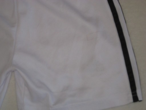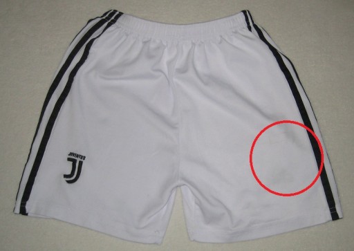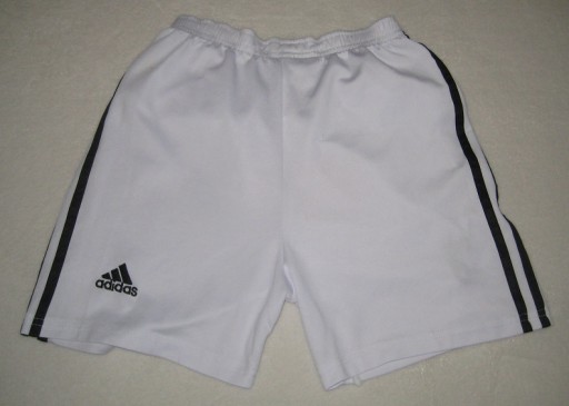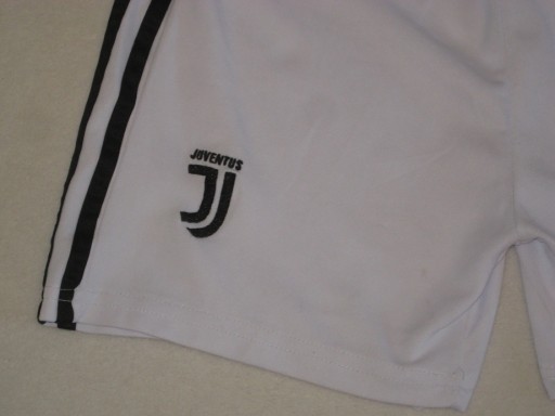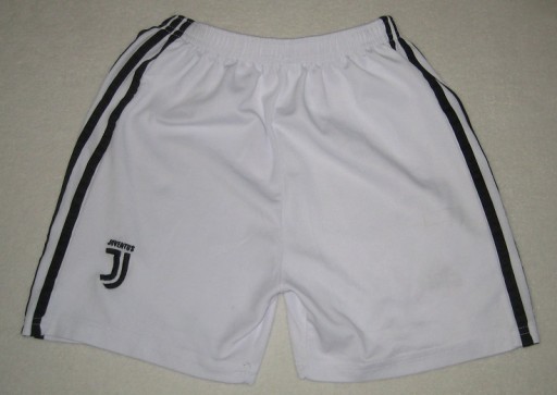 Spodenki sportowe Adidas w barwach Juve. Produkt prawdopodobnie oryginalny - brak metki. Rozmiar: prawdopodobnie XS lub S (mniejsze od M) - brak metki. Brak sznurka, gumka. Wymiary: pas 26 cm, długość nogawki 38 cm. Używane. Stan jak na zdjęciach - powyciągane nitki, plamy od środka, ślad po nadruku. Z Włoch. Cena za 1 szt.