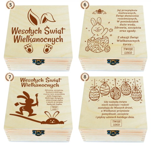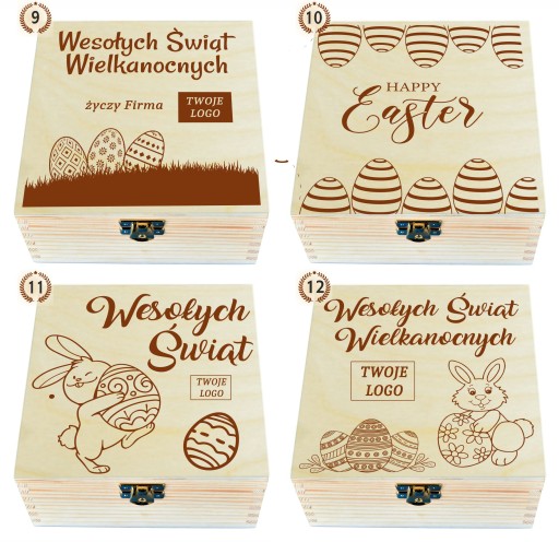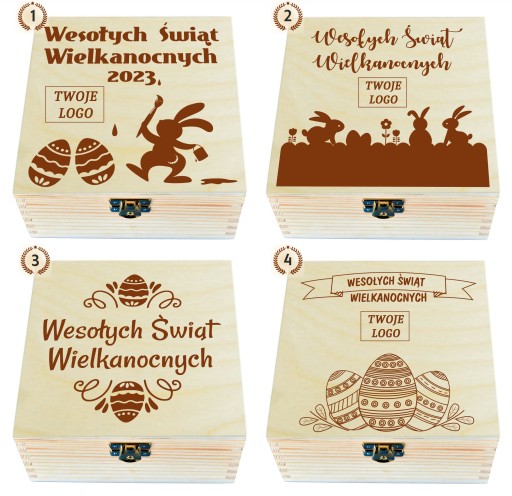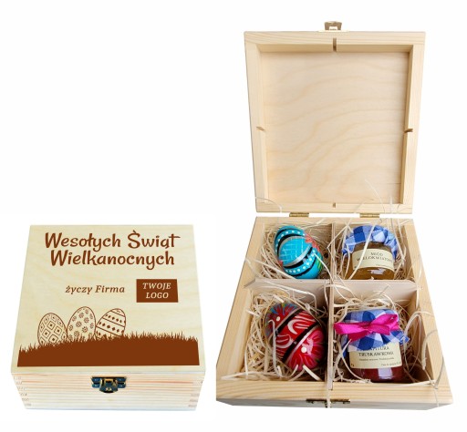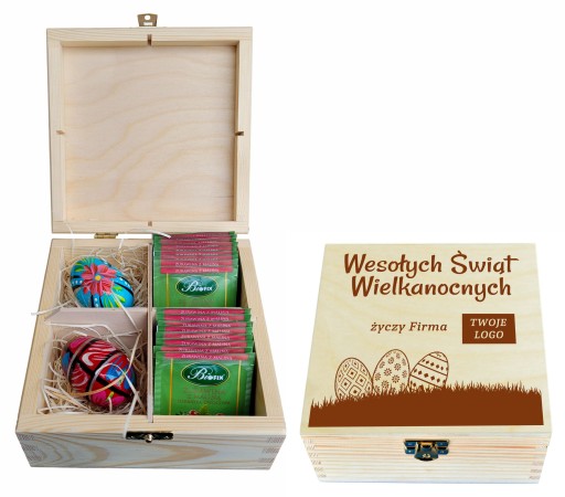 WIELKANOCNE, DREWNIANE PUDEŁKO NA HERBATĘ Z 4 PRZEGRÓDKAMI FIRMOWE LOGO