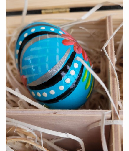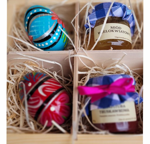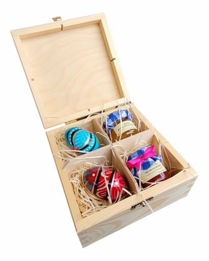 - PUDEŁKO WYPEŁNIONE JEST HERBATKĄ I JAJKAMI RĘCZNIE MALOWANYMI ORAZ W DRUGIEJ WERSJI KONFITURĄ TRUSKAWKOWĄ, MIODEM ORAZ JAJKAMI RĘCZNIE MALOWANYMI