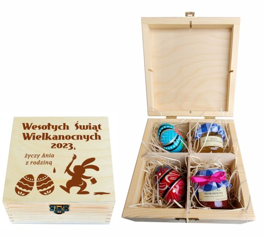 - PUDEŁKO WYPEŁNIONE JEST HERBATKĄ I JAJKAMI RĘCZNIE MALOWANYMI ORAZ W DRUGIEJ WERSJI KONFITURĄ TRUSKAWKOWĄ, MIODEM ORAZ JAJKAMI RĘCZNIE MALOWANYMI