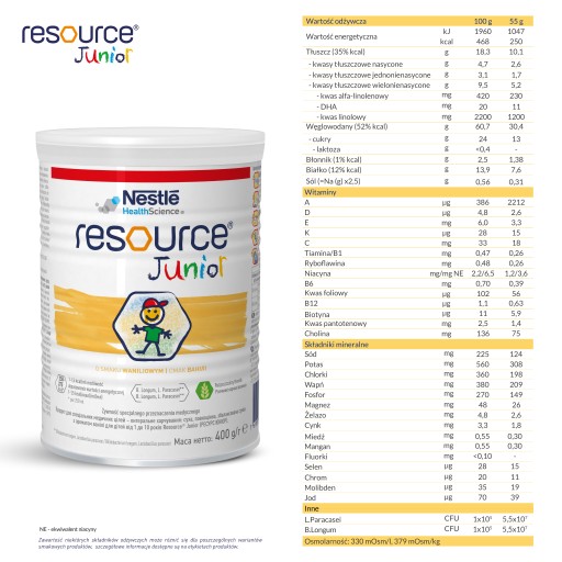 To kompletna pod względem odżywczym dieta przeznaczona dla dzieci powyżej 1. roku życia. Skonsultuj z lekarzem wprowadzenie do diety produktu Resource Junior.