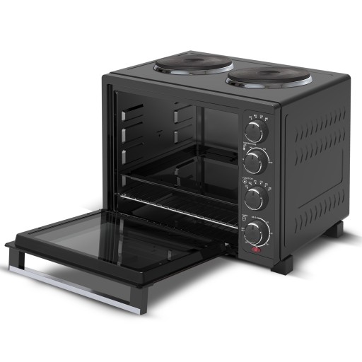 Urządzenie jest intuicyjne w obsłudze. Ma sterowanie mechaniczne. Z przodu umieszczono 4 pokrętła, które umożliwiają m.in. regulacje temperatury od 100 do 350 stopni, ustawienie rodzaju i poziomy grzania czy ustawienie timera do 60 minut. Drzwi z nienagrzewającym się uchwytem otwierają się do dołu. Podwójne szkło zapewnia lepszą izolację ciepła oraz sprawia, że zewnętrzna szyba nie nagrzewa się tak szybko. Produkt wyposażono także w ergonomiczne nóżki, które umożliwiają stabilne ustawienie piekarnika na każdej powierzchni. Dodatkowym atutem jest wbudowane oświetlenie.