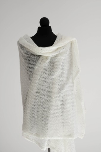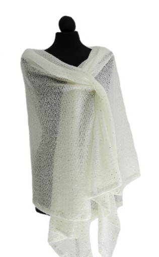 Szal ślubny z dzianiny w kolorze śmietankowym z delikatną nutą koloru ecru, nowy. Wykonany z miękkiej, miłej w dotyku dzianiny swetrowej, ażurowej, z dodatkiem cekinów w kolorze srebrnym błyszczącym. Szal jest lekki, dzięki temu można go drapować i układać na wiele sposobów.