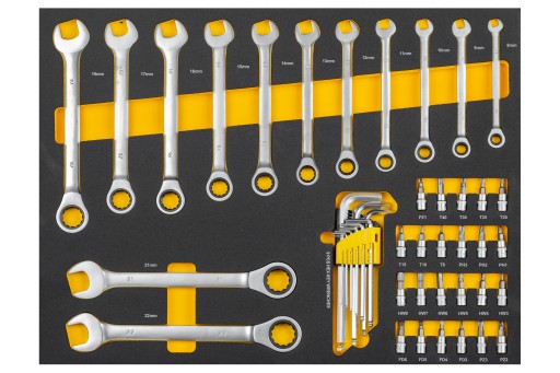 Narzędzia stanowiące wyposażenie wózka to 156 elementów wykonanych ze stali chromowo-wanadowej (CrV), która odznacza się wysoką odpornością na zużycie i odkształcenia. Grzechotki wyposażone zostały w system Quick Release oraz 72-zębowy mechanizm zapadkowy.