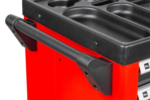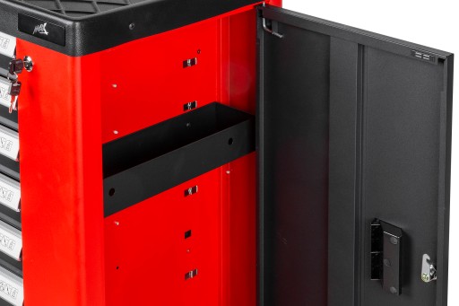 Z boku szafki znajduje się schowek również zamykany na klucz, dzięki czemu zyskujemy dodatkowe miejsce na przechowywanie. Ergonomiczne uchwyty oraz koła ułatwią manewrowanie wózkiem, natomiast hamulce pozwolą zablokować wózek w żądanej pozycji.